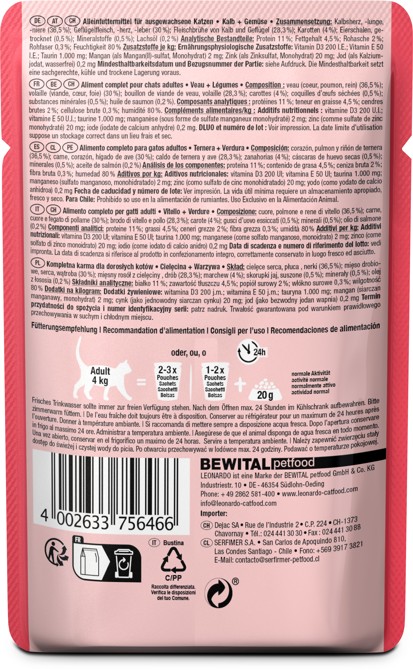 Hier kommen Gemüseliebhaber auf ihre Kosten: Denn neben der Hauptzutat - dem zarten Kalbfleisch in Premium-Qualität - steckt in LEONARDO Kalb + Gemüse das Beste aus dem Beet in Form schonend gegarter Karotten. Das enthaltene Lachsöl mit mehrfach ungesättigten Fettsäuren bringt zudem auch das Fell zum Glänzen.