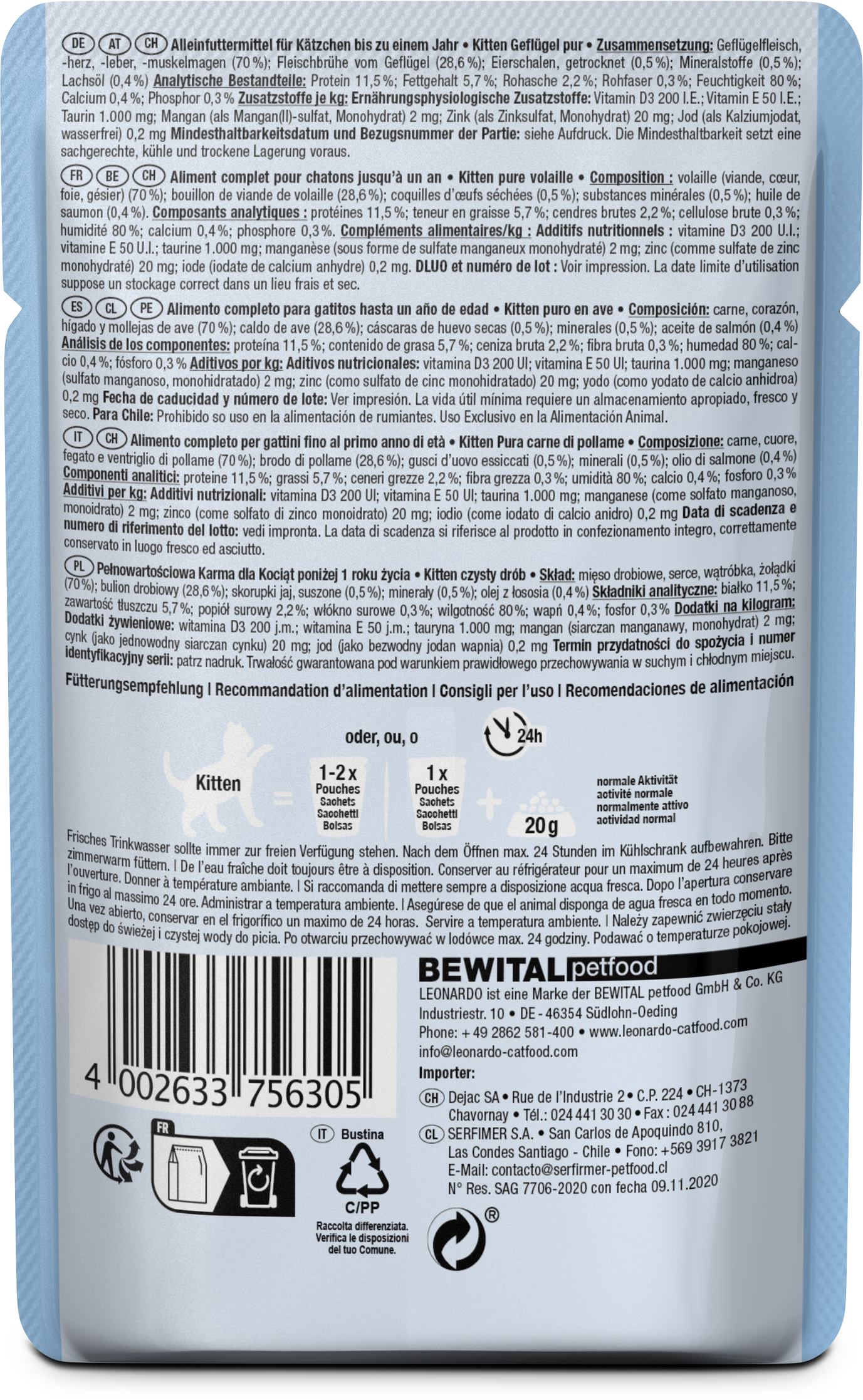 Große Klasse für die Kleinsten: Geflügelfleisch kombiniert mit nährstoffreichen Innereien – diese speziell auf kleine Schleckermäulchen abgestimmte Rezeptur ist leicht bekömmlich und bietet alles, was das Kätzchen braucht, um optimal und glücklich ins Leben zu starten. Und sorgt noch dazu für glänzendes Fell: Denn LEONARDO Kitten Geflügel Pur enthält Lachsöl, das mehrfach ungesättigte Fettsäuren liefert.