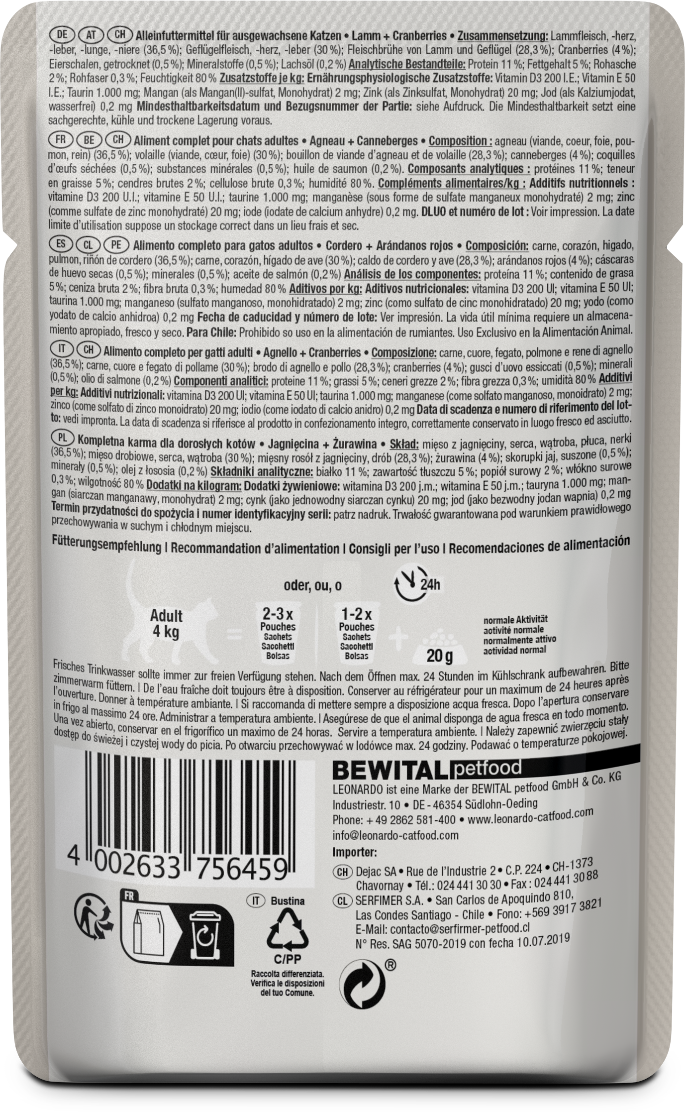 ZusammensetzungLammfleisch, -herz, -leber, -lunge, -niere (36,5 %); Geflügelfleisch, -herz, -leber (30 %); Fleischbrühe von Lamm und Geflügel (28,3 %); Cranberries (4 %); Eierschalen*¹ (0,5 %); Mineralstoffe (0,5 %); Lachsöl (0,2 %) *¹getrocknet