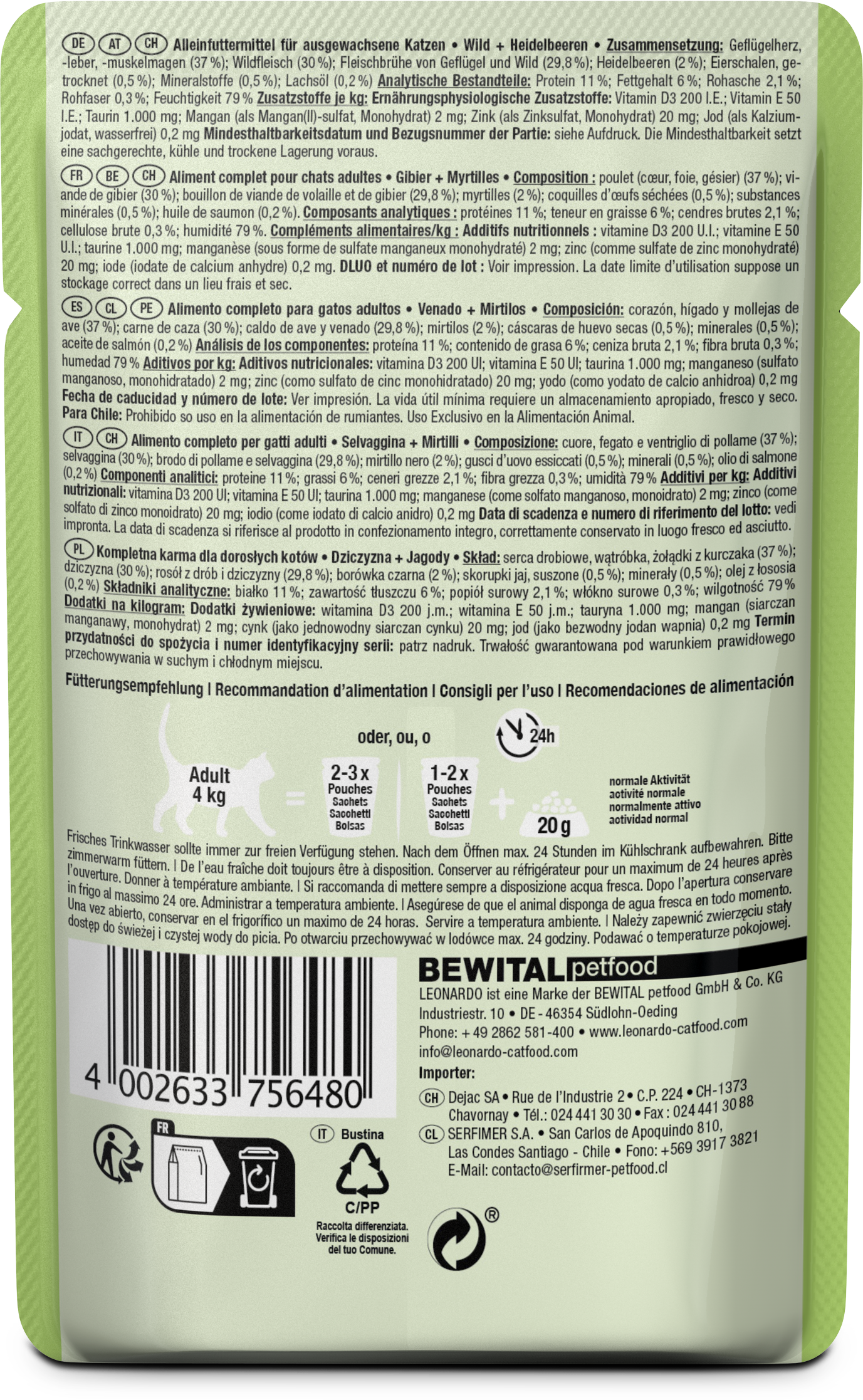 Wild auf Heidelbeeren: Fettarmes Wildfleisch in bester Qualität, besonders schmackhaft verfeinert mit hochwertigem Geflügel und fruchtig abgerundet mit Heidelbeeren – LEONARDO Wild + Heidelbeeren ist ein Gaumenschmaus, der für Freude bei Samtpfoten sorgt. Und für ein glänzendes Fell: dank Lachsöl, das mehrfach ungesättigte Fettsäuren liefert.