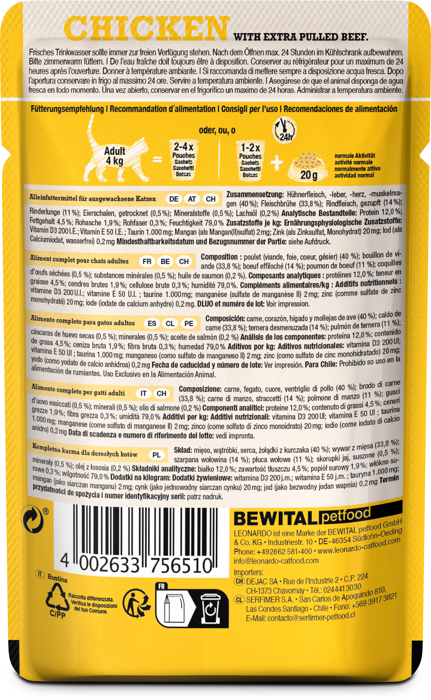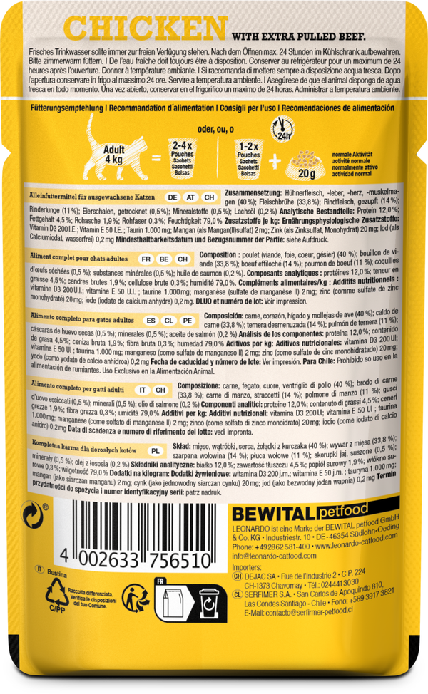 LEONARDO Chicken + extra pulled Beef - das ist saftiges Hühnchenpâté, kombiniert mit gezupftem Rindfleisch. Ob bei einem Barbecue mit Pulled Meat oder einem Pulled Beef Burger im Restaurant - in Erinnerung bleiben immer das einzigartige „Kauerlebnis" und der besondere Geschmack des gezupften Fleisches. Mit dem neuen „LEONARDO Pulled Beef“ kommen jetzt auch Katzen in genau diesen Genuss! Jede Portion wird schonend gegart und mit Lachsöl verfeinert. Lachsöl liefert zudem mehrfach ungesättigte Fettsäuren für ein besonders seidiges Fell.
