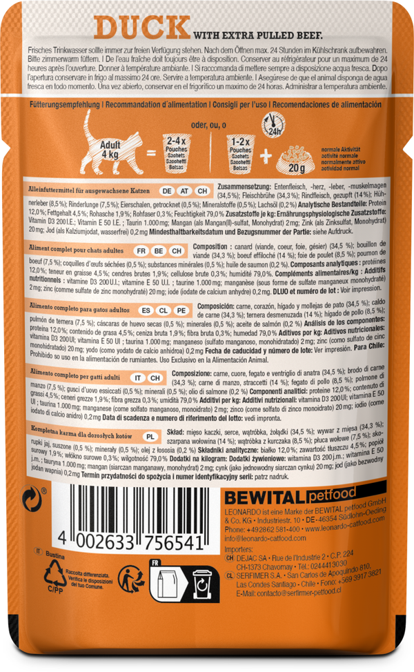 LEONARDO Duck + extra pulled Beef - das ist saftiges Entenpâté, kombiniert mit gezupftem Rindfleisch. Ob bei einem Barbecue mit Pulled Meat oder einem Pulled Beef Burger im Restaurant - in Erinnerung bleiben immer das einzigartige „Kauerlebnis" und der besondere Geschmack des gezupften Fleisches. Mit dem neuen „LEONARDO Pulled Beef“ kommen jetzt auch Katzen in genau diesen Genuss! Jede Portion wird schonend gegart und mit Lachsöl verfeinert. Lachsöl liefert zudem mehrfach ungesättigte Fettsäuren für ein besonders seidiges Fell.